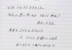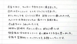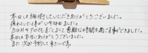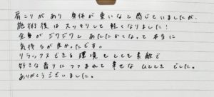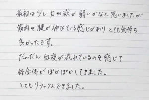 本日は施術していただきありがとうございました。疲れていた体がいやされました。