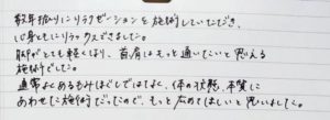 施術の説明も沢山して頂いて、終わる頃には体全体がポカポカしていて良く眠れそうだなと思いました。
